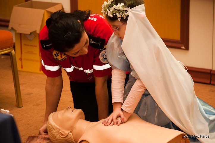 Au urmat apoi lecţiile de prim ajutor unde a trebuit să simt un fior rece pe spate când mi-am văzut prinţesa făcând respiraţie gură la gură unui manechin. Oricum încă un mare bravo şi pentru această idee şi pentru oamenii de acolo, aflaţi la alt gen de “datorie” de dimineaţă, dar extrem de amabili şi de doritori să ajute copiii chiar dacă era trecut de opt seara.