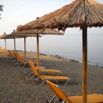 Ieşind înapoi în şoseaua principală, avem două posibilităţi; printr-o bătrână pădure de pini se ajunge repede la Phyloxenia, un complex alb, cu două piscine şi restaurant. La şosea, la mică distanţă, se afla staţiunea cu centre de informare, magazine, terase, hoteluri, restaurante, baruri, centre de închiriere maşini (de la 35 de euro) şi motociclete (de la 2o de euro) un loc de joacă pentru copii, plajă mare, cu un crâng de umbrele şi pătuţuri (plătite), bărci pe mare, lume…