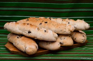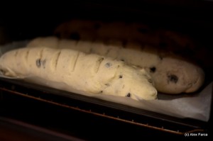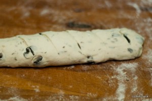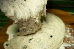 Evident că puteam folosi mijloace mecanizate (vezi maşina de pâine), dar vrem să se mai vadă şi să se simtă măslinele. Obţinem un aluat maleabil pe care-l impărţim după cât de mare vrem să fie pâinea. Putem face baghete, chifle şi ce ne mai trece prin cap. Întindem aluatul cu sucitorul şi apoi îl rulăm în forma dorită. Cu un cuţit ascuţit facem nişte mici crestături. Punem în tavă, acoperim şi lăsăm la crescut încă o jumătate de oră.