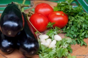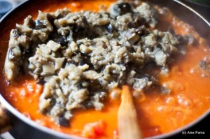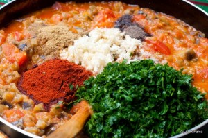 Într-o tigaie adăugăm 2 linguri ulei de măsline, 3 roşii mari fără pieliţă şi tăiate cubuleţe, aruncăm peste ele vinetele fierte şi le asezonăm cu un mănunchi de miresme: 1 lingură de usturoi mărunţit, 1 linguriţă de cumin, 1 linguriţă de boia de ardei dulce, 1 jumătate de lingurăţă de sare, piper după gust. Ca să fim în ton cu natura aruncăm un sfert de cană de pătrunjel verde şi un sfert de cană de coriandru verde. Amestecăm şi lăsăm pe foc mediu 25-30 minute. Între timp nu ne vom odihni ci vom zdrobi cu o lingură de lemn amestecul din tigaie. Cu 5 minute înainte de a opri focul adăugăm o linguriţă de oţet. Amestecăm şi gata. Se poate mânca rece sau caldă funcţie de anotimp (sau orele zilei :=)).