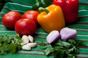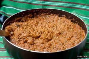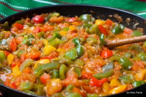 Este o salată de legume – cubuleţe. Tăiem o ceapă mare, un ardei verde mare (pentru că reţeta mea a fost multiplicată – am folosit pe lângă cel verde, ardei galben şi roşu), 3 roşii fără pieliţă în cubuleţe. Într-o tigaie punem 2 linguri de ulei şi asezonăm cu câte 1 linguriţă piper, sare, boia de ardei dulce, usturoi tocat, usturoi tocat (nu e greşeală sunt 2 linguriţe). Călim timp de 5 minute, după care adăugăm roşiile şi lăsăm pe foc mediu 10 minute. Adăugăm ardeiul, amestecăm şi mai lăsăm 20 minute. Gata.