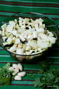 Zaalouk, sau mai pe româneşte zacuscă marocană. Începem cu o vânătă mare pe care o facem zebră, după care o tăiem cubuleţe. Punem cubuleţele la fiert în apă cu sare pentru o jumătate de oră, după care le scoatem într-o sită şi îndepărtăm pe cât posibil cât mai multă apă, prin presare cu o lingură.