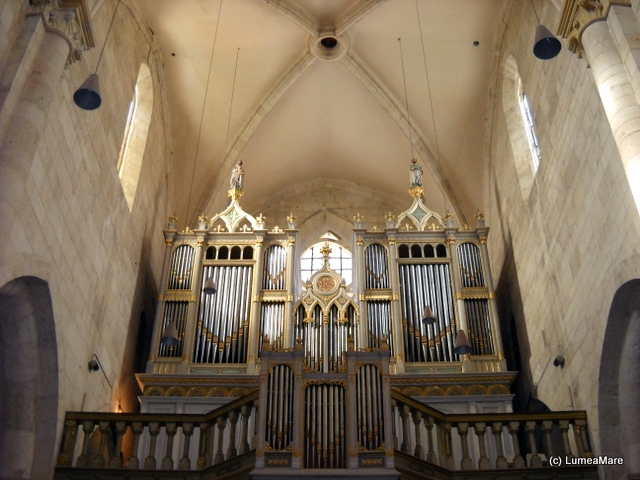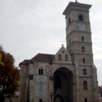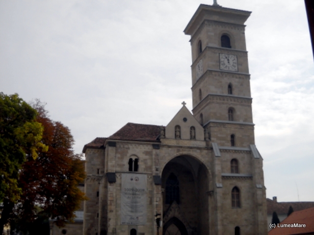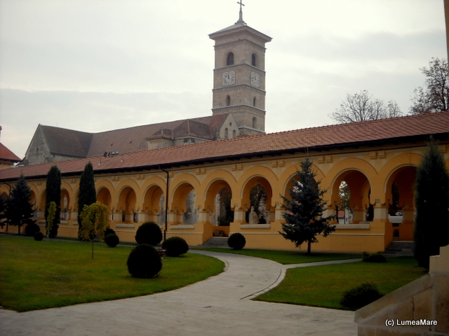 În apropiere, Catedrala Romano-Catolică, construită şi completată între 1927 şi 1736, reuneşte stilurile epocilor care au marcat-o: romanic, gotic, renascentist, baroc şi adăposteşte sarcofagele familiei Huniazilor, principi maghiari şi pietrele de mormânt ale unor episcopi. Sobrietatea decoraţiei interioare şi dimensiunile ne-au amintit de Batalha şi Alcobaca, bazilici monumentale din Portugalia ca şi de castelele medievale, unde lipsesc deasemenea picturile de pe pereţi şi bolţi fără ca acest detaliu să le ştirbească valoarea. Cred că de la Mediterana până la Marea Nordului principii de bază şi motive arhitecturale au circulat intens din moment ce stâlpişori semicirculari împodobesc pereţii curbaţi ai unor capele de la Castillo de Loarre (Spania) până la Albă Iulia!