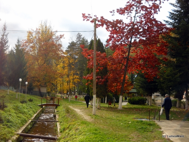 Sejur în Transilvania la Geoagiu Băi, o mică staţiune situată într-o “găleată” înconjurată de coline împădurite, posesoare de izvoare călduţe cu valoare terapeutică. Izolată de vacarmul oraşelor mari, şosele principale, căi ferate, putea să fie locul ideal în care să pândim cum vine tiptil toamna. Aşa ar fi fost dacă, în activitatea de modernizare, nu ar fi scormonit, ridicat, împrăştiat pământ, pietriş, nisip, nişte maşini galbene, într-un ritm foarte lent. Ba, ca şi cum drumurile nu erau suficient de răscolite, au fost aduse şi nişte stive de borduri ceea ce a dus la apariţia unor tranşee peste care populaţia venită la tratament trebuia să treacă cumva, care cu baston care cu diferite dureri la purtător. Aşa că ne-am hotărât să căutăm în jur şi am ales un drum lăturalnic, asfaltat, pentru a ne bucura de de bolţile aurii şi arămii ale frunzişurilor.