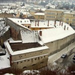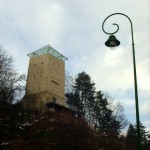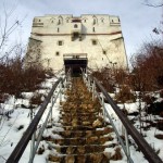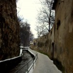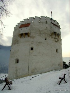 Continuând de-a lungul aleilor ajungem la Turnul Alb. Acesta este ceva mai mare şi îl găsim tot închis. Numele şi-l datorează vopselei albe cu care a fost îmbrăcat mereu. Terasa mare oferă şi ea o panoramă spectaculoasă a oraşului, mai ales că terenul de sub noi este foarte accidentat şi parcă ne aflăm într-un balcon suspendat. Sub acesta am coborât pe nişte scări din piatră destul de abrupte, mai ales pe timp de iarnă când le-am găsit pline de gheaţă. Ne-au coborât până la Bastionul Graft, o construcţie ridicată deasupra drumului şi deasupra apei care se scurge prin canalul amenajat de-a lungul acestei laturi a cetăţii. El uneşte zidul cetăţii cu zidurile de stâncă ale versantului. Coborâm scările şi trecem pe sub o arcadă pe partea cealaltă. Continuăm să mergem pe Aleea ”După ziduri”, păstrând pe stânga canalul, pădurea şi din când în când mai vedem câte o gaură în stâncile dintre copaci. Cam toate erau astupate cu grilaje. Îmi zboară gândul la fel de fel de tunele întortocheate care fac legătura între cetate şi celelalte fortificaţii. Oare cum era pe vremea războaielor, când toate aceste ruine încă ţineau piept inamicilor şi fiecare cărămidă era preţioasă?