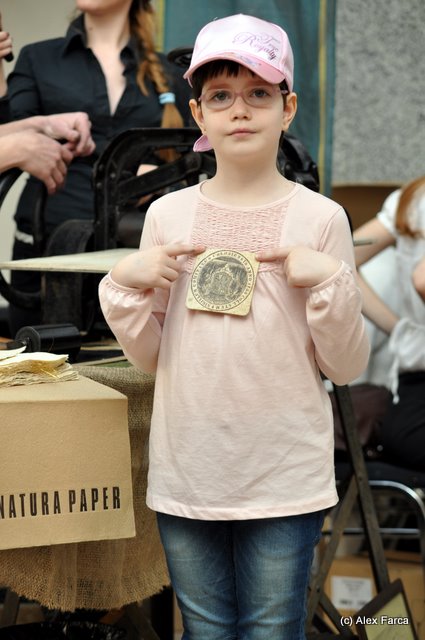 Cum LumeaMică era nerăbdătoare am poposit la standul celor de la Natura Paper, unde Petra a participat activ la obţinerea foii de hârtie şi a imprimării unui “biscuite”.