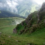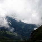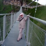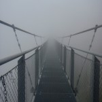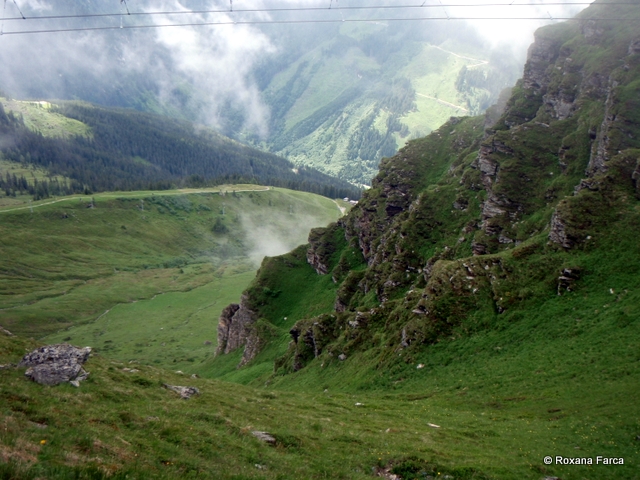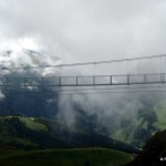 Priveliştea din telecabină e minunată, se poate vedea foarte bine întreaga vale. Dar odată ajunşi sus nu apucăm să vedem munţii mai mult de două minute că un nor ceţos, gros şi nesuferit se lasă peste noi, peste pod, peste tot. Despre pod sau atracţiile turistice de pe munţi am mai scris în Turism de masă pe munte – până unde?