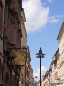 Mai întâi, o informaţie practică: există două centre de informare turistică – unul aflat chiar la ieşirea din gară, iar celălalt în Altstadt (centrul vechi), lângă primărie – de unde vă puteţi procura hărţi şi ghiduri şi unde puteţi cere diverse informaţii. De la gară se ajunge uşor în centrul istoric, practic din Bismarckplatz intri pe strada principală (Hauptstraße) care te conduce direct în Alstadt. Cu o lungime de aproape 2 km, Hauptstraße este cea mai lungă stradă comercială din Germania, două treimi din aceasta fiind închise circulaţiei rutiere. Aşadar, ce poate fi mai indicat decât o plimbare pe această, să‑i zicem, alee pietonală? „Animată” este puţin spus când vine vorba de atmosfera plină de energie a acestei străzi, unde se află zeci şi zeci de magazine de toate felurile, cafenele, restaurante şi baruri. Ca să nu mai spun că auzi toate limbile pământului vorbindu‑se în jurul tău. Pe Hauptstraße nu mai pridideşti uitându‑te în stânga şi în dreapta, sunt o grămadă de tentaţii la tot pasul. De exemplu, o mică prăvălie are vitrina plină cu sticle de culoare roşie: lichior de căpşuni. Domnii strâmbă din nas, ştiu, băuturile dulci sunt pentru fete. Poate, însă când am degustat licoarea dulce si parfumată, cât pe ce să mă ia cu ameţeală de tare ce era! Un alt mic magazin avea expusă o cutie cu bulgări de zăpadă: nişte prăjituri din aluat umplute cu diverse creme. Am gustat şi eu un bulgăre din ăsta că prea arătau bine, însă n‑am fost foarte impresionată de gust. Oricum, merita o încercare dat fiind că era ceva nou pentru mine. Altfel, după cum am zis, aici găseşti de toate pentru toţi, inclusiv un magazin unde se inscripţionează tricouri, asta în cazul în care v‑aţi îndrăgostit de Heidelberg şi vreţi ca suvenir un tricou personalizat la un preţ cât de cât rezonabil (între 12 şi 20 de euro).