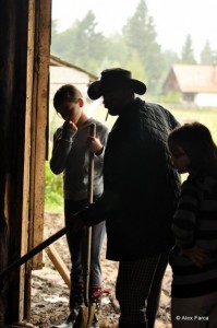 Când am sosit noi era o zi umedă, ploioasă, dar care a devenit destul de repede însorită. Aş fi ales din prima podul cu fân, dar LumeaMică a intrat ţinându-se de nas în grajd (lucru de care nu s-a lăsat nici după 10 zile), a urcat apoi pe scara care ducea sus şi a renunţat. Am încercat apoi să ne punem tabăra în casă, dar s-a speriat când a văzut că ceilalţi copii erau destul de mari şi a preferat să ne retragem la cortul personal. Vreo două seri am dârdâit de frig, chiar dacă aveam saltea plus saci buni şi groşi, am tresărit la zgomote necunoscute, la urletul câinilor husky sau la lătratul câinelui ce ar fi alungat ca pe un mare inamic chiar şi pe un şoricel. Nu ştiam asta în prima noapte, când l-am ascultat mârâind şi lătrând timp de mai bine de jumătate de oră în preajma cortului, aş fi jurat că mai e puţin şi văd gheara ursului la lumina lunii. Nu mai aveam mult până să pun mâna pe telefon când am auzit strigătul lui Zoli, trimis de Melania să dea pe „mute” câinele lătrător, pentru a nu face infarct orăşenii din cort!