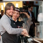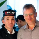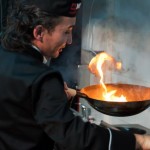 P: Şi s-a pus Alex pe încins tigaia cu două linguri de ulei. A scurs uleiul, a adăugat o lingură de ulei, a scăzut temperatura şi a adăugat încet bucăţile de pui trecute în prealabil prin amidon şi un pic de ou. Carnea nu s-a prins ceea ce a fost un lucru bun. A mărit temperatura şi când carnea şi-a schimbat culoarea a adăugat cubuleţele de morcovi, şi a mai învârtit puţin apoi le-a scos din tigaie. Apoi a venit rândul pastei de ardei – la temperatură medie, amestecată atât cât să simţi mirosul specific de ardei foarte puţin caramelizat. La ordin a venit ceapa, usturoiul, sare, zahăr, sos de soia – se gustă pentru verifica balansul de sărat, dulce – se adaugă amidonul şi două linguri de supă. Se adaugă apoi cubuleţele de pui şi morcovi, bucăţile de castravete şi alunele. 10 secunde şi gata. În final se adaugă oţetul chinezesc şi uleiul iute … Totul bineînţeles cu ajutorul şi sub supravegherea blândă şi răbdătoare a lui Tushin.