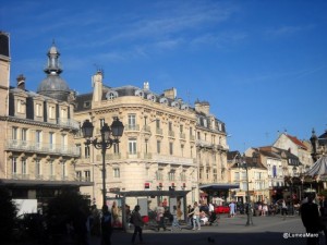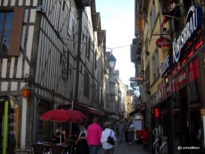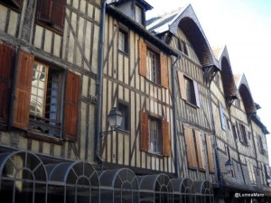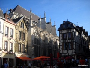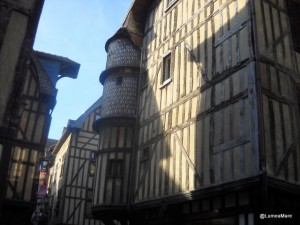 Am făcut apoi cunoştinţă cu centrul vechi atât de bătrân încât o parte din numeroasele construcţii din lemn (colombaje) de pe marginea unei largi pieţe erau şleampăte (înclinate total sau numai câte o porţiune). Obişnuitul contrast dintre bârnele la vedere, maro închis şi umplutură de zidărie zugrăvită în alb sau culori calde ce face farmecul acestui tip de construcţii aici era prezent în mică măsură iar lipsa lui genera un aer vetust şi obosit (a se citi trist şi ponosit). Una era evul mediu al satelor (Rochefort – en terre, Rocamadour, Sarlat) castelelor şi cetăţilor (Carcassonne) construite din piatră, altul cel al colombajelor de aici, unele în stare de ebrietate. Atmosfera altor timpuri ne-a învăluit totuşi treptat iar când soarele apunea ne-a plăcut plimbarea pe străduţele înguste şi umbrite ce dădeau în piaţa centrală.