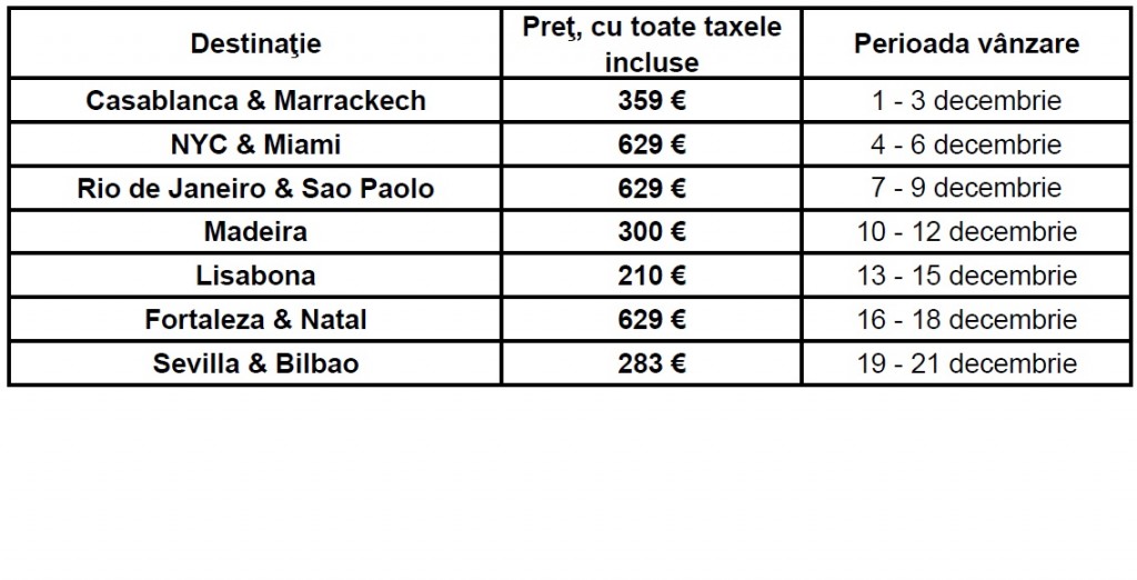 – Sederea minimă: weekend/3 zile pentru LIS, FNC, BIO, SVQ (Portugalia si Spania) weekend/6 zile pentru celelalte destinaţii