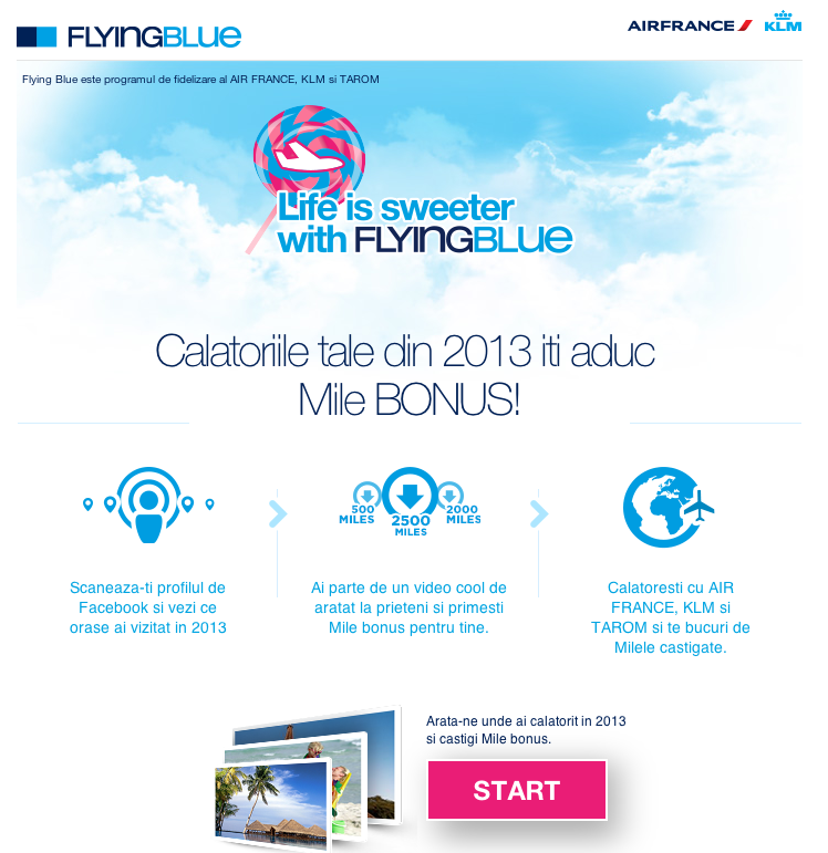 - Cei care nu au deja card, adică non-membrii Flying Blue, dar care au instalat aplicaţia Facebook, au avut check-in-uri eligibile în 2013 (în afara ţării de reşedinţă) şi au generat un video, vor putea primi 2000 de mile bonus. Cei care îl distribuie mai departe prietenilor de pe Facebook, vor primi un bonus de 500 de mile.